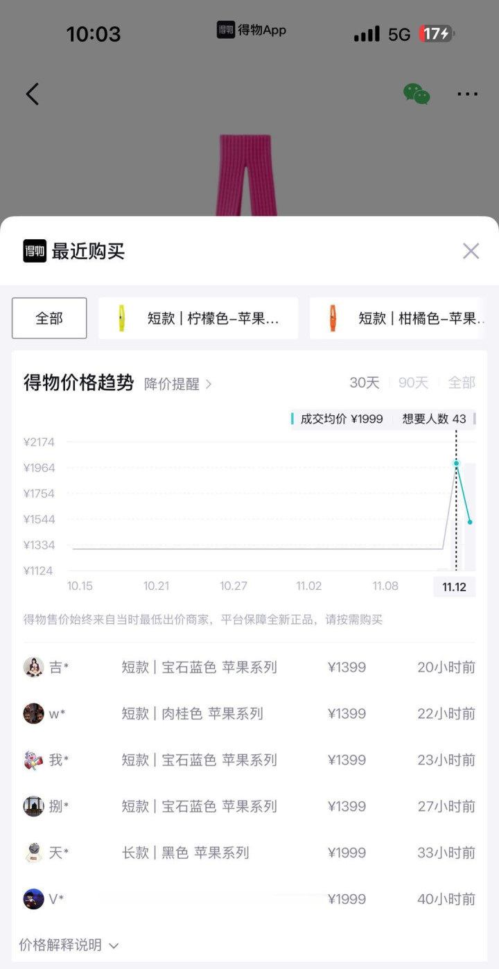 此次推出的iPhone Pocket分为短款和长款两个版本,短款售价1299元,提供柠檬色、柑橘色、紫色等八种色彩;长款售价1899元,拥有宝石蓝色、肉桂色、黑色三种选择。开售不久后,肉桂色长款便率先售罄,潮玩平台得物上,长款市场价已涨至2399元,短款涨至1699元,溢价幅度最高达500元。