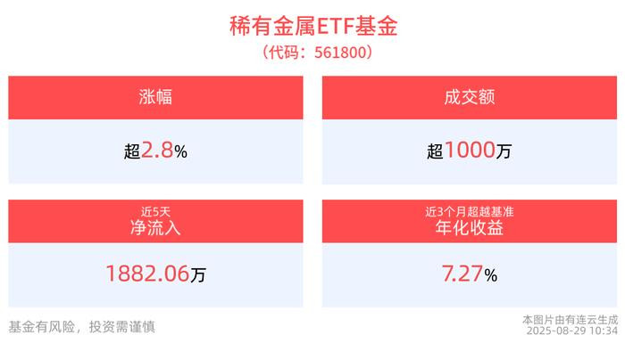 流动性方面,稀有金属ETF基金盘中换手9.58%,成交1312.05万元。拉长时间看,截至8月28日,稀有金属ETF基金近1周日均成交1967.44万元。资金流入方面,拉长时间看,稀有金属ETF基金近5个交易日内,合计“吸金”1882.06万元。