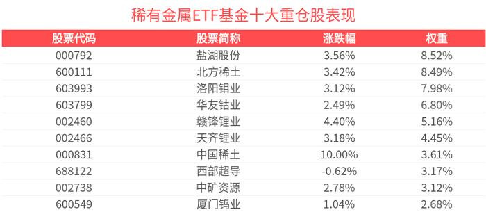 数据显示,截至2025年7月31日,中证稀有金属主题指数(930632)前十大权重股分别为北方稀土(600111)、盐湖股份(000792)、洛阳钼业(603993)、华友钴业(603799)、赣锋锂业(002460)、天齐锂业(002466)、中国稀土(000831)、盛和资源(600392)、中矿资源(002738)、西部超导(688122),前十大权重股合计占比55.85%。