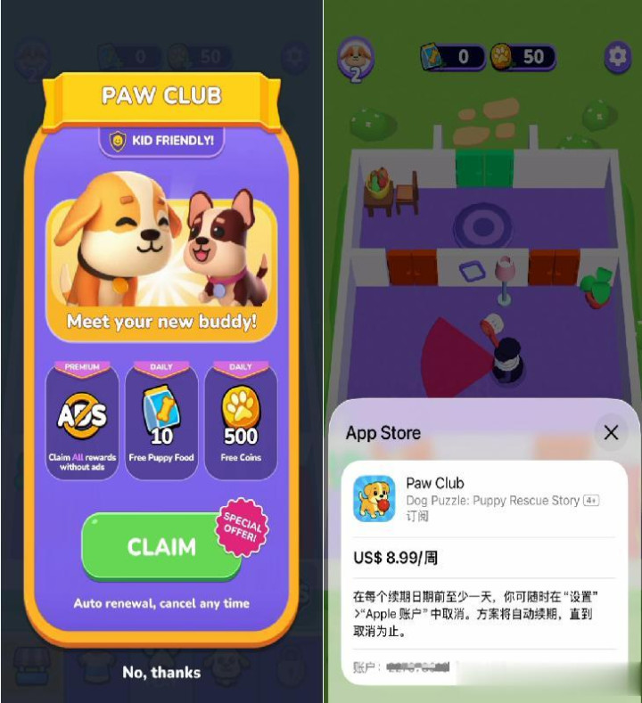 IAP部分,《Dog Escape》为了保证玩家最大沉浸度,初期近乎看不到任何IAP商店购买方式,但会在游戏开始的首关推送周卡相关的购买信息。其次,玩家只有在与收养宠物的互动(喂养及玩耍)缺乏相应资源后,才会被动弹出对应购买提示。其中,玩家在《Dog Escape》关卡内获取的拼图碎片抽奖对应皮肤,则视为皮肤体验版,用于后续承接皮肤礼包对应付费。