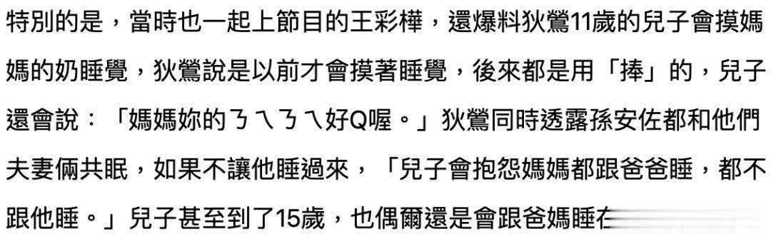 她说孙安佐曾经抱怨妈妈为什么不陪自己睡,反而跟爸爸搂在一起。